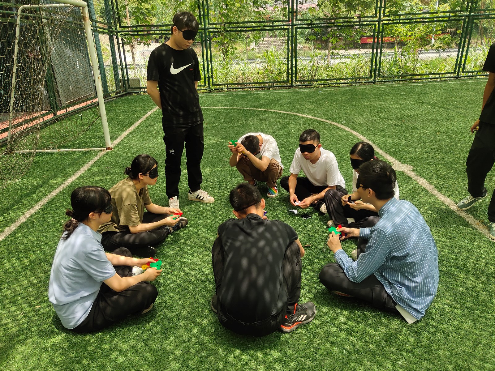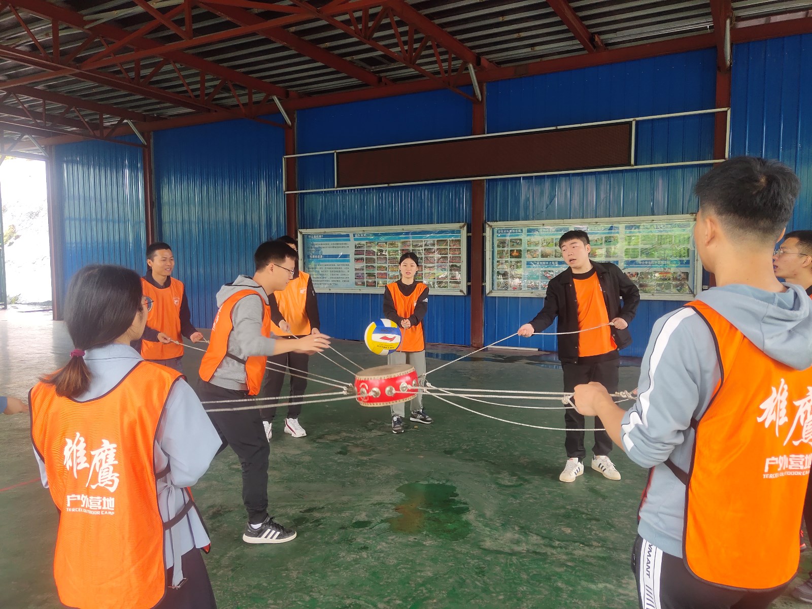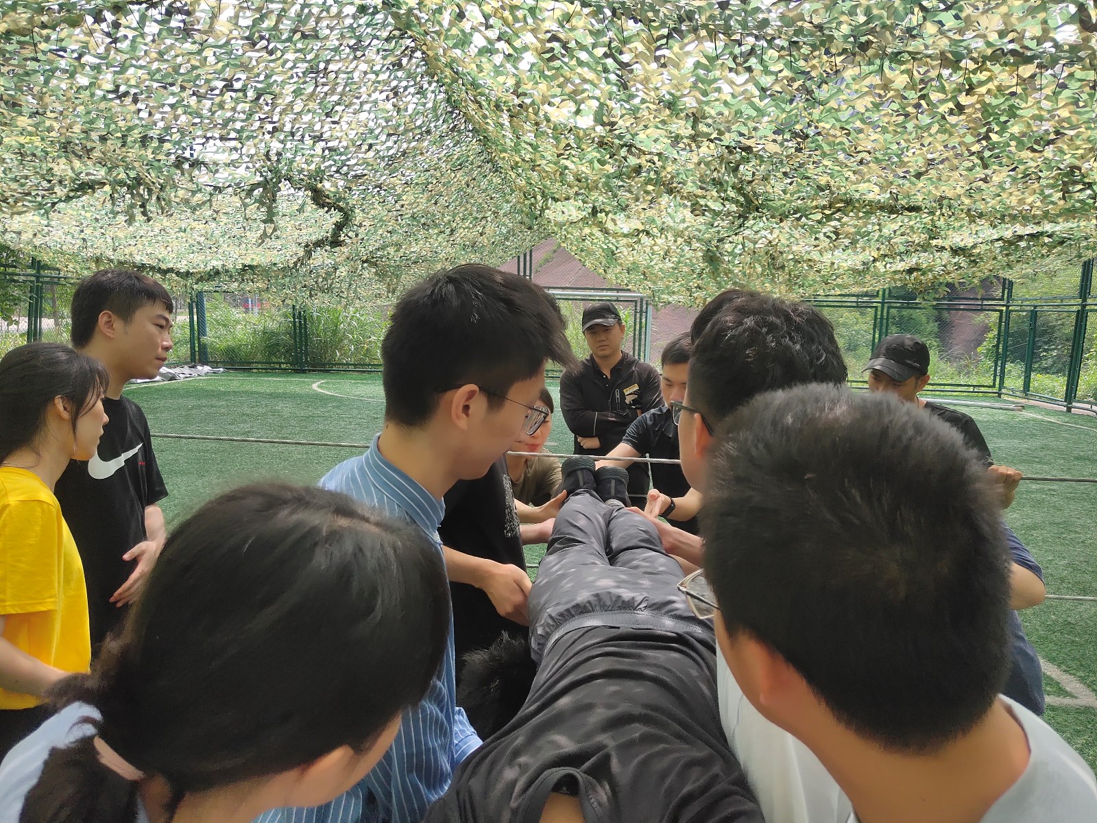 穿越電網(wǎng)要求隊(duì)員們從一個(gè)離地1米4,高度30公分,寬度40公分的繩圈中逐一通過,全程身體不能觸碰繩圈,否則即為“觸電”,只要一個(gè)人“觸電”,全隊(duì)需重新開始挑戰(zhàn)起初大家各執(zhí)己見、多次嘗試無果后士氣略顯低落,但是沒有人想過放棄,在一次次的失敗中總結(jié)經(jīng)驗(yàn),根據(jù)網(wǎng)格的大小和隊(duì)員的體形,合理安排順序,人人各展所長(zhǎng),有人指揮、有人幫助、有人防護(hù),所有、抬、托、舉”手段都用上了,最后全體隊(duì)員通過“電網(wǎng)”。